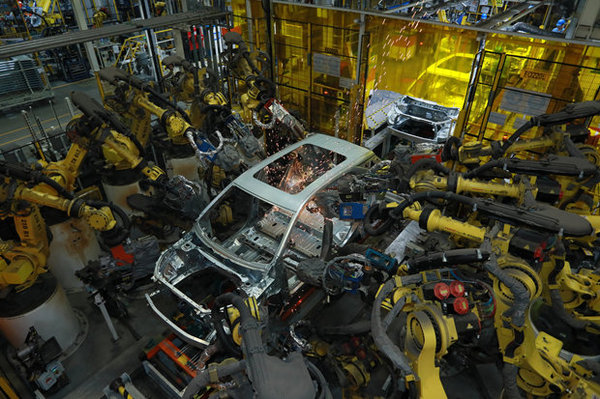曾經(jīng),流水線的生產(chǎn)方式讓工業(yè)生產(chǎn)的效率幾何式的上升,而現(xiàn)在最能提高生產(chǎn)效率和安全性的無(wú)疑是自動(dòng)化生產(chǎn)。武漢工廠的車身車間擁有773臺(tái)世界先進(jìn)的Global 3+機(jī)器人,焊接自動(dòng)化率是100%,而它的油漆車間內(nèi)外表面油漆的噴涂也100%是由機(jī)器人作業(yè)的。