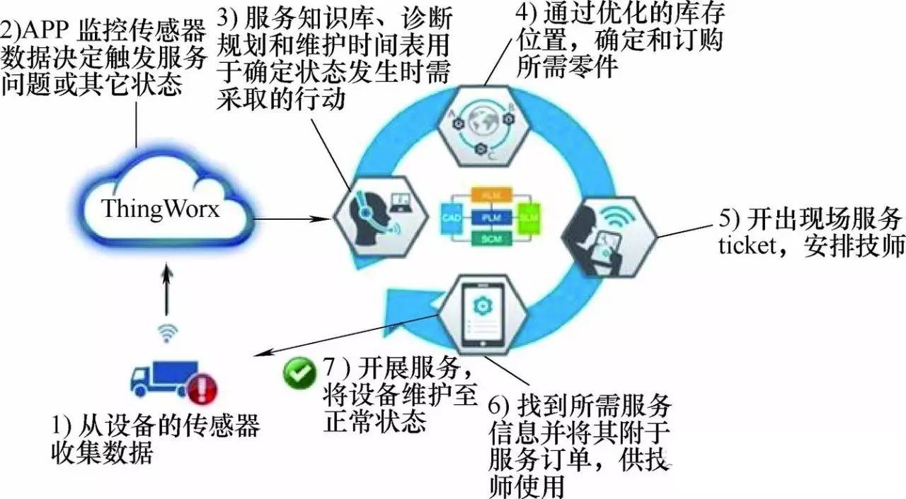 圖7是PTC公司利用ThingWork平臺所做的設(shè)備維護(hù)工作,生產(chǎn)設(shè)備的數(shù)據(jù)通過傳感器收集后進(jìn)行分析,對需要維護(hù)的設(shè)備制訂相應(yīng)計劃,在設(shè)備故障前及時進(jìn)行處理。