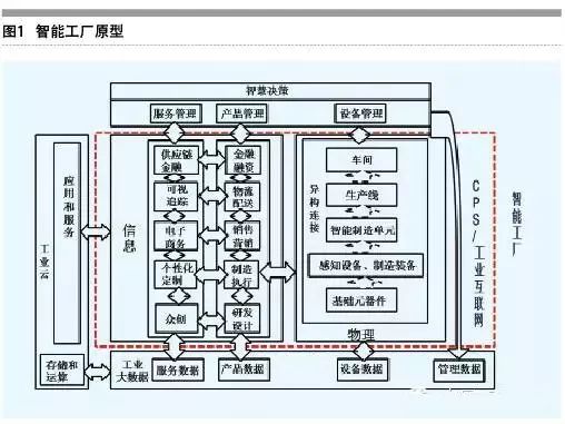 企業(yè)基于CPS和工業(yè)互聯(lián)網(wǎng)構(gòu)建的智能工廠原型,主要包括物理層、信息層、大數(shù)據(jù)層、工業(yè)云層、決策層。其中,物理層包含工廠內(nèi)不同層級(jí)的硬件設(shè)備,從最小的嵌入設(shè)備和基礎(chǔ)元器件開(kāi)始,到感知設(shè)備、制造設(shè)備、制造單元和生產(chǎn)線,相互間均實(shí)現(xiàn)互聯(lián)互通。以此為基礎(chǔ),構(gòu)建了一個(gè)“可測(cè)可控、可產(chǎn)可管”的縱向集成環(huán)境。信息層涵蓋企業(yè)經(jīng)營(yíng)業(yè)務(wù)各個(gè)環(huán)節(jié),包含研發(fā)設(shè)計(jì)、生產(chǎn)制造、營(yíng)銷服務(wù)、物流配送等各類經(jīng)營(yíng)管理活動(dòng),以及由此產(chǎn)生的眾創(chuàng)、個(gè)性化定制、電子商務(wù)、可視追蹤等相關(guān)業(yè)務(wù)。在此基礎(chǔ)上,形成了企業(yè)內(nèi)部?jī)r(jià)值鏈的橫向集成環(huán)境,實(shí)現(xiàn)數(shù)據(jù)和信息的流通和交換。