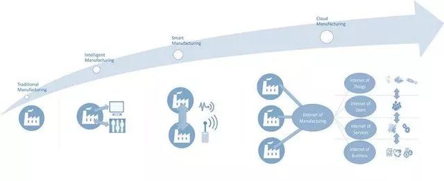 圖片展示了云制造的概念,以及從傳統(tǒng)制造,到智能制造,到智慧制造,到今天的云制造的過(guò)程。