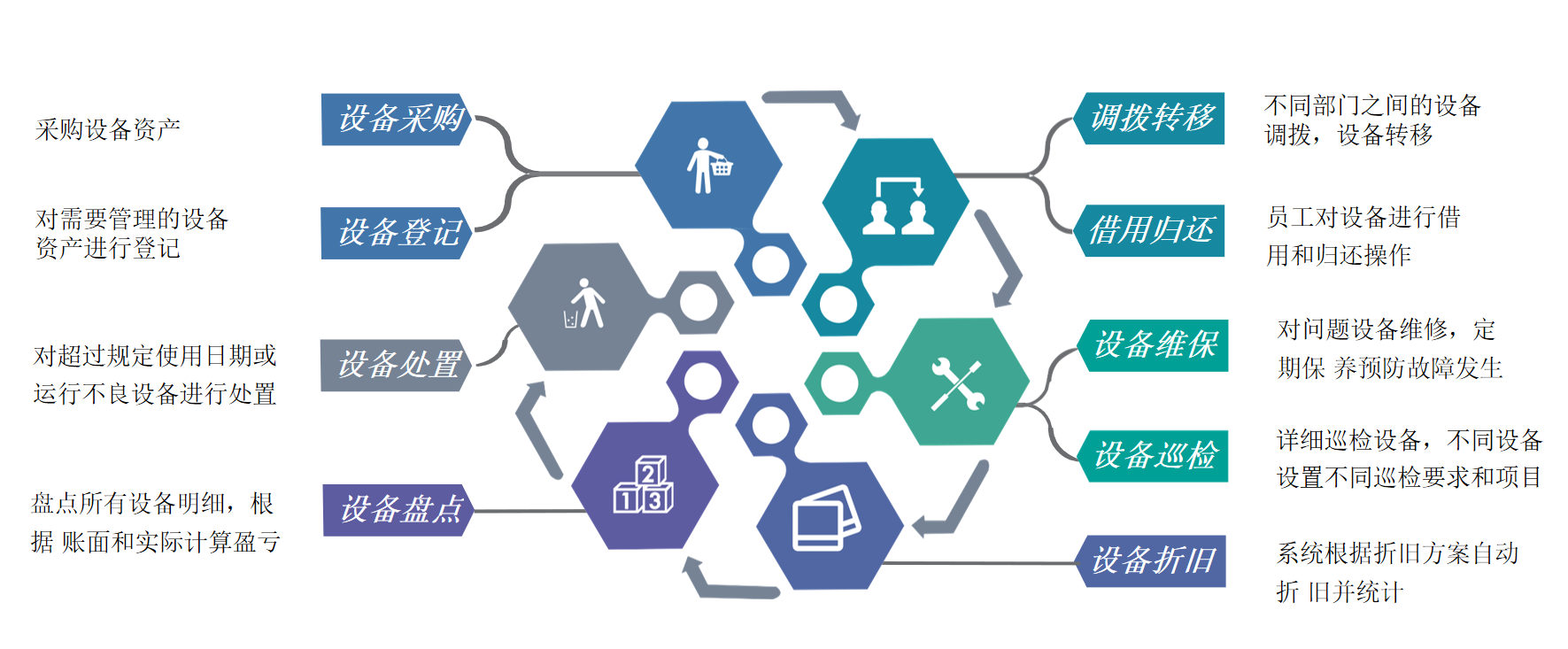 完成對設備日常使用的核算和管理,全面反映設備的增加、減少及相關變動情況,提供設備減值及折舊的計提與分攤、設備調撥轉移的管理、針對設備全生命周期的跟蹤管理,實現(xiàn)更有效、更全面地管理設備。