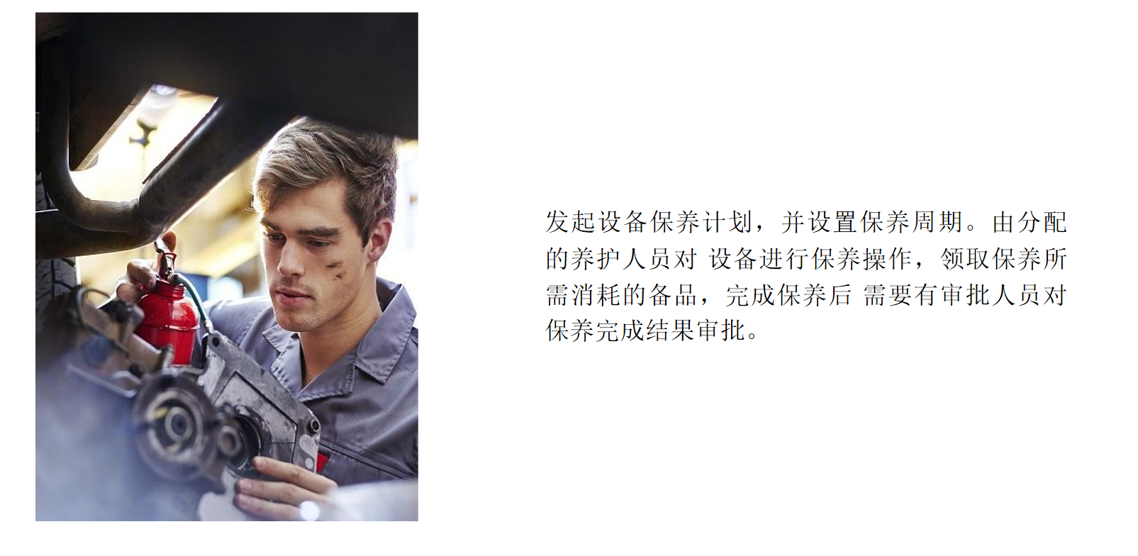 計劃保養(yǎng)、保養(yǎng)實施、保養(yǎng)領料、設備巡檢、設備潤滑、設備檢修、設備技改