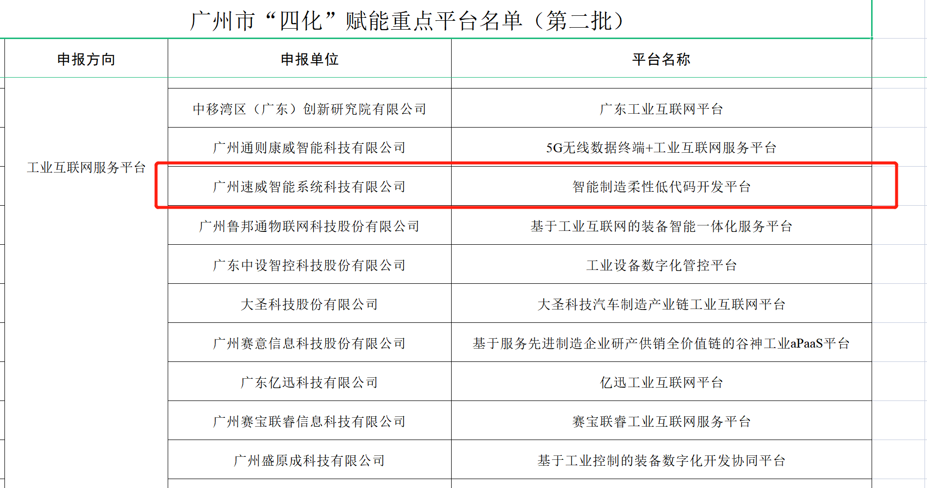 2023年7月14日,廣州市工業(yè)和信息化局公布了第二批廣州市“四化”賦能重點(diǎn)平臺名單,廣州速威自主研發(fā)的智能制造柔性低代碼開發(fā)平臺,成功在全省數(shù)百家供應(yīng)商中脫穎而出,入選到廣州工信局“四化”賦能工業(yè)互聯(lián)網(wǎng)服務(wù)平臺18家的大名單中。