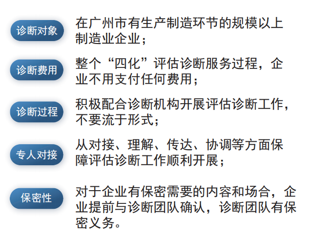 對于開展“四化”評估診斷工作企業(yè)無需支付任何費(fèi)用,費(fèi)用由廣州市工業(yè)和信息化局直接向第三方評估診斷機(jī)構(gòu)提供,市工業(yè)和信息化局通過迸選、備案等方式確定診斷機(jī)構(gòu)名單。
