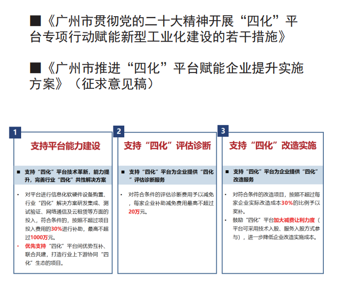完成“四化”評估診斷的企業(yè),才能進(jìn)行“四化”改造實施等相關(guān)補(bǔ)貼申請,企業(yè)進(jìn)行設(shè)備更新改造、系統(tǒng)升級、上新數(shù)字化產(chǎn)品等,有機(jī)會向廣州市工業(yè)和信息化局申請費(fèi)用補(bǔ)貼,具體《申報指南》預(yù)計7月份左右發(fā)布。