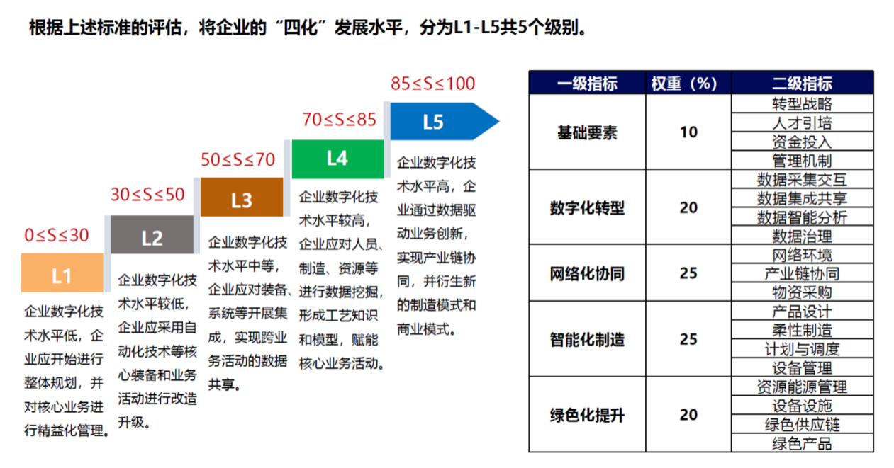 從基礎(chǔ)要素等五大維度,轉(zhuǎn)型戰(zhàn)略、資金投入等20余個二級指標(biāo),分析企業(yè)面臨的不足和困難,找準(zhǔn)轉(zhuǎn)型關(guān)鍵點(diǎn)。
