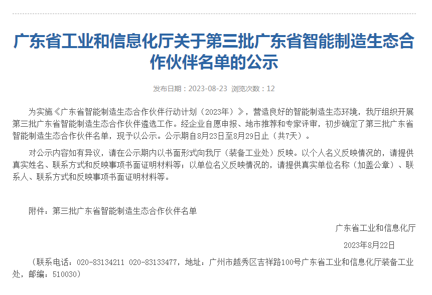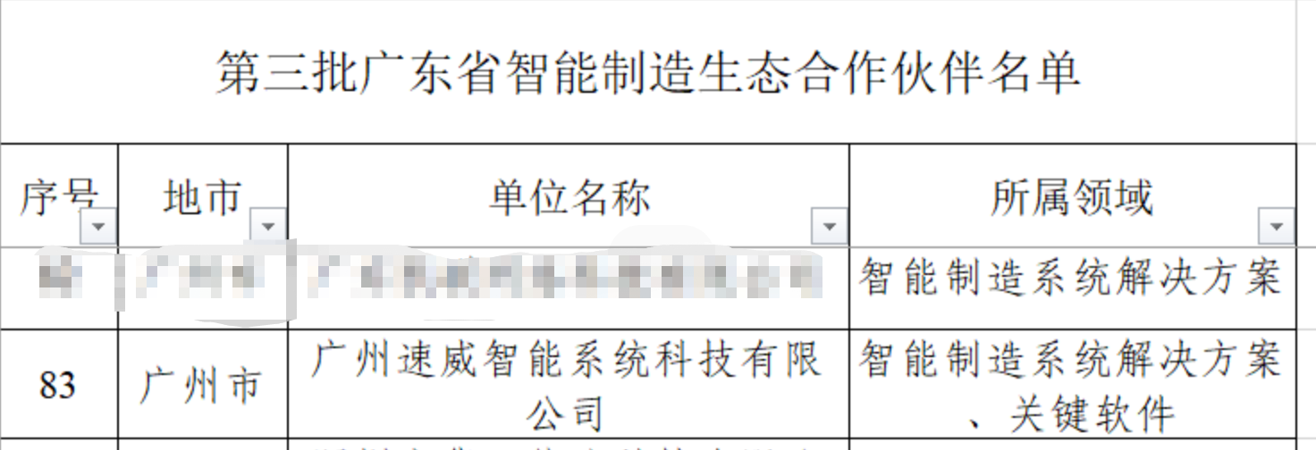 2023年8月22日,廣東省工業(yè)和信息化廳對(duì)第三批廣東省智能制造生態(tài)合作伙伴名單進(jìn)行了公示,速威有幸入選到這份大名單中,成為全省15位智能制造系統(tǒng)解決方案的廠商之一!