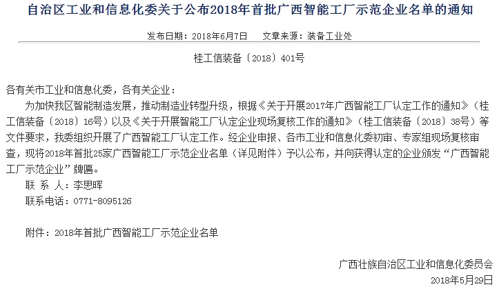 自治區(qū)工業(yè)和信息化委關(guān)于公布2018年首批廣西智能工廠示范企業(yè)名單的通知