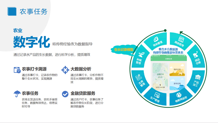 可對(duì)農(nóng)場(chǎng)全生產(chǎn)流程的每個(gè)環(huán)節(jié)進(jìn)行信息化、智能化管理,包括規(guī)劃生產(chǎn)流程、自動(dòng)化任務(wù)管理、即時(shí)溝通交流、巡園監(jiān)督管理、病蟲害圖像識(shí)別、農(nóng)資投入品管理等。