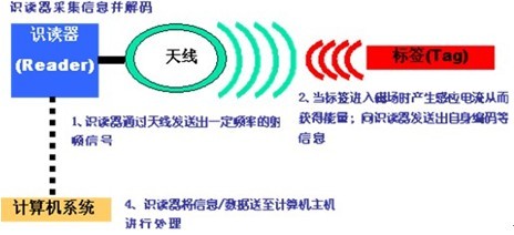 ⑤固定式讀寫器、手持式讀寫器 采用RFID芯片及天線、控制器、控制軟件等設(shè)備構(gòu)成射頻標(biāo)簽管理系統(tǒng),這是一種前瞻性的物流設(shè)施設(shè)備,系統(tǒng)中的閱讀器將高頻的加密數(shù)據(jù)載波信號經(jīng)發(fā)射天線向外發(fā)送,射頻卡進(jìn)入低頻的發(fā)射天線工作區(qū)域后被激活,同時將加密的載有目標(biāo)識別碼載波信號經(jīng)芯片線圈內(nèi)高頻發(fā)射出去,接收天線接收到射頻信號后,經(jīng)閱讀器接收處理后,提取出目標(biāo)識別碼至計算機(jī),完成預(yù)設(shè)的系統(tǒng)功能和自動識別,實現(xiàn)目標(biāo)的自動化管理。工作頻率:13.56MHZ,感測距離:0~1M。 RFID讀寫器網(wǎng)絡(luò)流程圖