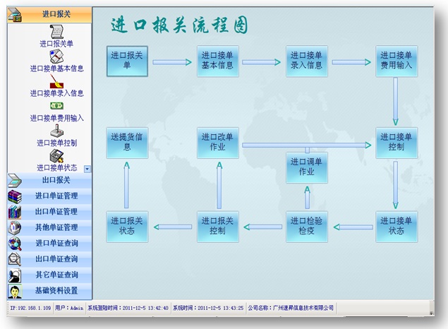 該《報關管理系統(tǒng)》主要分為進口報關、出口報關、基礎資料、進口單證管理、出口單證管理、進口單證查詢等大模塊。